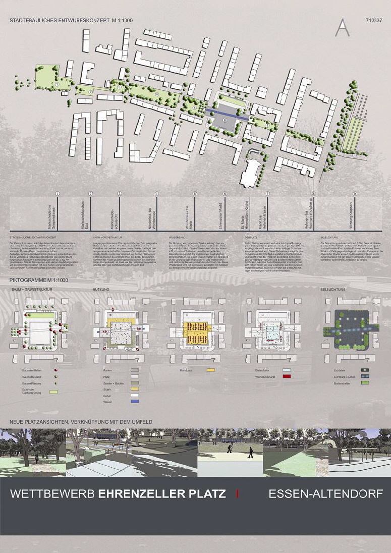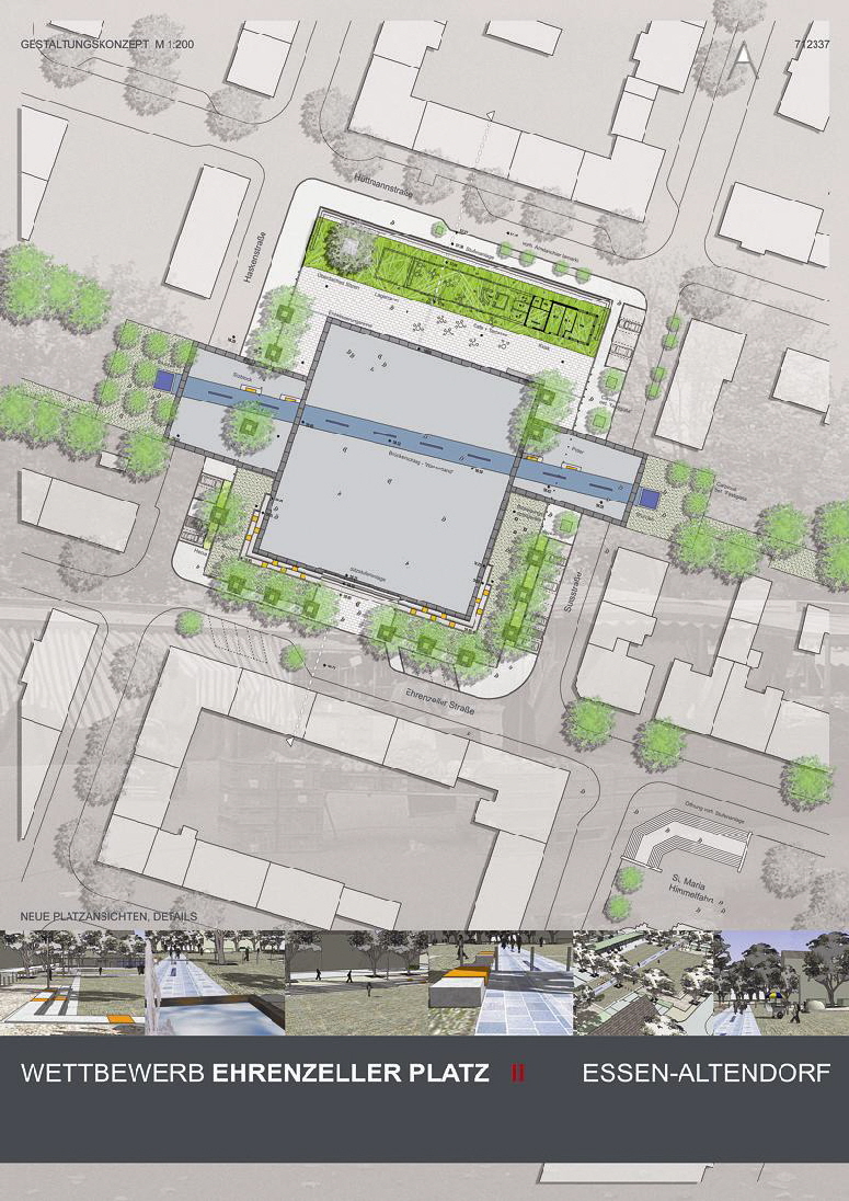 Der Ehrenzeller Platz liegt In Essen-Altendorf nördlich der Altendorfer Straße. Der Stadtteil ist geprägt durch eine kompakte Wohnbebauung, sowie einen im Rahmen des Strukturwandels hohen Migranten- und Arbeitslosenanteil. Die Nutzung beschränkt sich im Wesentlichen auf die Markttage. Der Platz wird gerahmt von einer 3 bis 4-stöckigen geschlossenen Bebauung und befindet sich in einem Wohnquartier mit fast ausschließlich verkehrsberuhigten Zonen. Prägendes Merkmal der derzeitigen Situation sind die den Platz einfassenden Platanen. Sie bilden einen grünen Rahmen und trennen diesen vom Straßenraum. Am nordöstlichen Platzende gibt es einen Kiosk mit einer öffentlichen Toilettenanlage, welche nur an Markttagen geöffnet ist. Der Bereich um den vorhandenen Kiosk bietet keine Aufenthaltsqualität. Der Platz soll im neuen städtebaulichen Kontext die vorhandene Lücke des Grünzuges in der Ost-West-Achse schließen und eine Überleitung in den entstehenden Krupp Park um das neu entstehende Thyssen Krupp Hauptquartier bilden. ... weiter