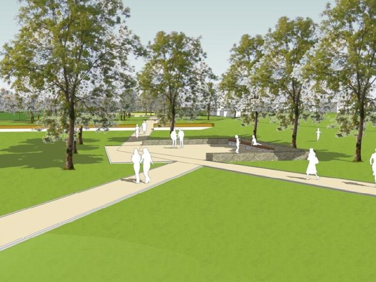 Eine weitere Attraktion stellt das - zunächst nördlich der Hackenbroicher Straße gelegene - Mais-Labyrinth dar. Der Entwurf sieht darüber hinaus vor, dass der Irrgarten mit Fertigstellung der weiteren Bauabschnitte (Ideenteil) seinen Standort in den radialen Bereich wechselt. Westlich des Rodelhügels, in der neuen Kleingartenanlage, wird die Bepflanzung am Baumraster der Obstwiese ausgerichtet. Die auf den angrenzenden Flurstücken im Westen und Norden befindlichen Baulichkeiten der Reitanlagen sind durch Baumreihen eingegrünt. Umliegende Weideflächen orientieren sich an den linearen bzw. radialen Strukturen. Nördlich des Rodelhügels - zwischen den beiden Reiterhöfen - ist ein Waldstück mit der potentiellen natürlichen Vegetation (Maiglöckchen-Perlgras-Buchenwald) aufgeforstet, in den nach der Aufforstung nur noch lenkend eingegriffen werden soll. An das im Süden liegende Sportzentrum grenzt eine nicht vereinsgebundene Cross-Strecke, die sowohl für Radfahrer (Mountainbike) als auch für Läufer (Cross und Gelände) vorgesehen ist.