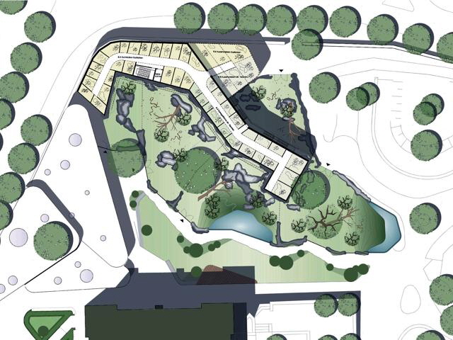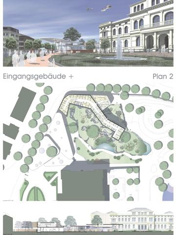 Die beiden seitlich vor dem Gesellschaftshaus liegenden Pflanzflächen werden in der Größe reduziert und symmetrisch ausgebildet. Die Zugänge werden von jeweils 2 großen Formgehölzsolitärs betont. Hier, wie auch im Pflanzbeet zwischen Zaun und dem Ovalparterre, dominieren kurz (auf Sockelniveau des vorgelagerten Zaunes) gehaltene hellgrüne Buchsbaumhecken in Verbindung mit weißen Rosen und Lavendel das Vegetationsbild. Südlich des Gesellschaftshauses werden die Stellplätze untergebracht. Die Stellplatzmarkierungen werden mit andersfarbigem Kleinpflaster in der Fläche abgebildet. Der Passéverband erstreckt sich bis in den Wirtschaftshof, in dem die notwendigen Stellplätze für LKW und Sattelzüge, sowie die Flächen für den Müll und das Kühlhaus nachgewiesen werden können. Nördlich des Gesellschaftshauses zieht sich das Natursteinpflaster durch den Haupteingangs- und Zooshop bis an die östliche Wettbewerbsgrenze und verbindet damit die eigentlich nicht direkt zusammenhängenden Freiflächen vor dem Gesellschaftshaus und dem neu entstehenden Haupteingangsbereich des Zoos mit dem anschließenden Bärengehege. Nach dem Passieren des Besucherfoyers öffnet sich vor dem Nasen- und Brillenbärengehege ein Platz der Besuchergruppen als Sammelplatz und Treffpunkt dient und Raum zur Orientierung bietet. Der Platz gibt bereits Einblicke in das Nasen- und Brillenbärengehege frei. Von hier aus startet man über einen waldartigen Weg entlang des Geheges, der in unterschiedlichen Perspektiven den Blick auf die Bären öffnet. Die Abtrennung erfolgt mit Kunstfelsen in Verbindung mit Trennscheiben aus Glas. Rechts des Weges wechseln offene und geschlossene Gehölzstrukturen.