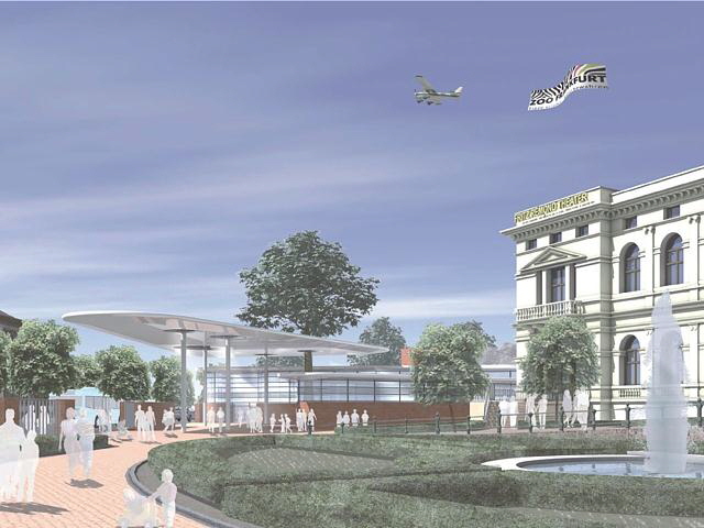 Aus dem vorhandenen Belagsraster des Alfred-Brehm-Platzes wird das Natursteinpflaster in der gleichen Pflasterrichtung als Passéverband in den neu organisierten und aufgeräumten Theatervorplatz hineingezogen. Es entsteht ein Verbund beider Räume mit einer klaren Platzkante zwischen dem öffentlichen und halböffentlichen Bereich. Die Platzkante wird überarbeitet und an den Ecken mit Blick auf die historischen Formen abgerundet. Entlang dieser Linienführung sorgt der geplante Zaun mit zwei - den U-Bahn Abgang einrahmenden - doppelflügeligen Toren für die vom Auslober gewünschte Abgeschlossenheit, die bereits auf historischen Fotoaufnahmen vorhanden war. Dem historischen Vorbild wird insgesamt bei der Gestaltung der Flächen vor dem Gesellschaftshaus Rechnung getragen. Zentrales Element ist das ovale Buchsbaum- und Rosenparterre mit dem mittig liegenden Wasserbecken im Zentrum des Vorplatzes.
