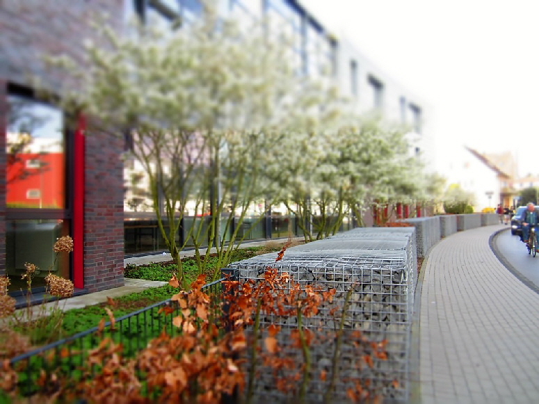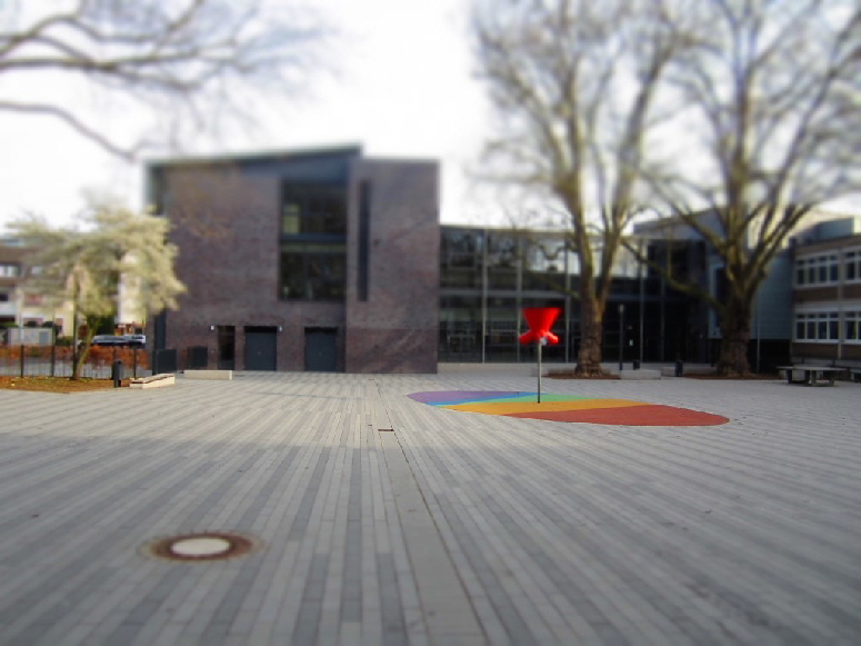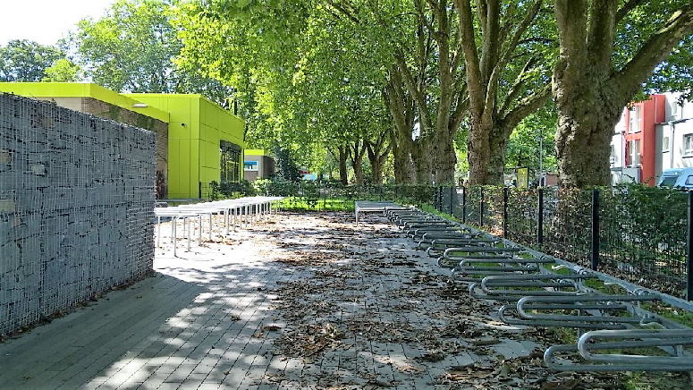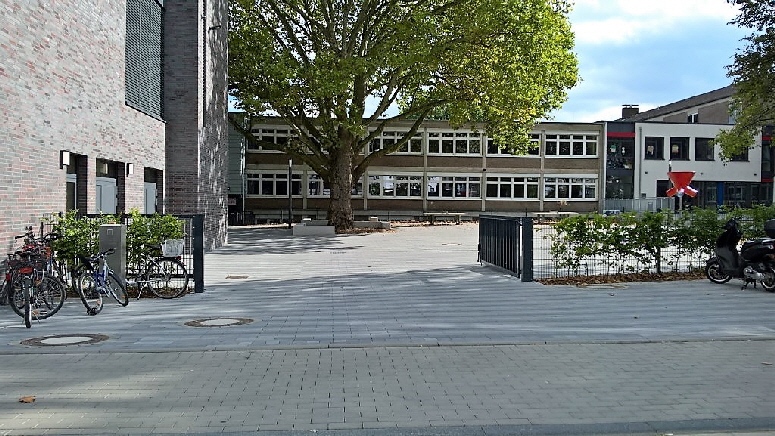 Umbau der bestehenden Haupt- und Realschule in eine Gesamtschule im laufenden Betrieb. Die Ausführung erfolgt in zwei Bauabschnitten. Im 1. Bauabschnitt wurde ein großer Pausenhof mit einer Flächengröße von etwas mehr als 2.200 m2 umgesetzt. Dieser Bereich soll nach Fertigstellung der Gesamtmaßnahme als Aufenthaltsbereich der Oberstufe dienen. Als Kontrast zur Klinkerfassade, der Glasfassade der Aula und den farbigen Trespa-Platten des Hochbaus wurde ein Rechteckpflaster im Langformat in drei unterschiedlichen Grautönen ausgewählt. Bestimmendes Merkmal des neuen Pausenhofes sind aber die großen vorhandenen Platanen, die den neuen Pausenhof auf zwei Seiten einrahmen.