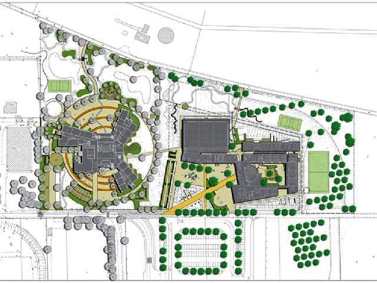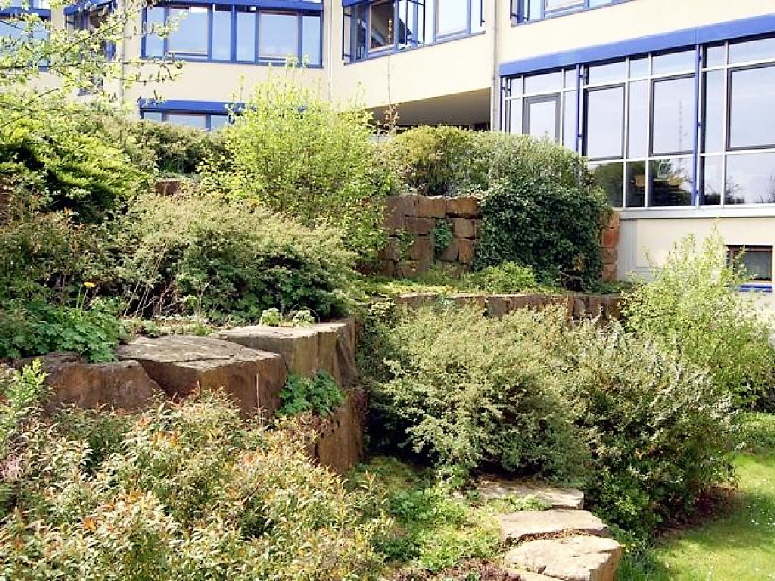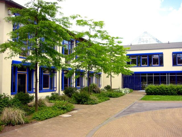 Das Zentrum des Gymnasiums ist das glasüberdachte Solarhaus, der ‘Innere Garten’, mit seiner mittlerweile üppigen, mediterranen Bepflanzung. Der ‘Innere Garten’ ist im Raumprogramm als überdachter Außenraum definiert. Gleichzeitig dient der Innere Garten genügend Raum für Ausstellungen und Veranstaltungen und ersetzt eine klassische Aula.