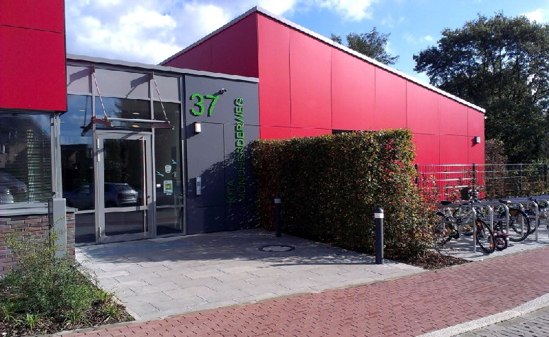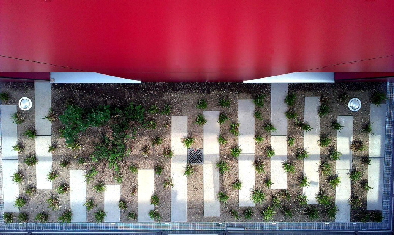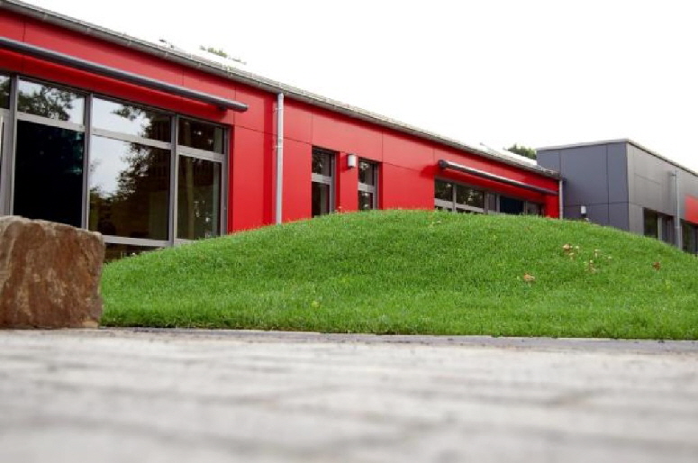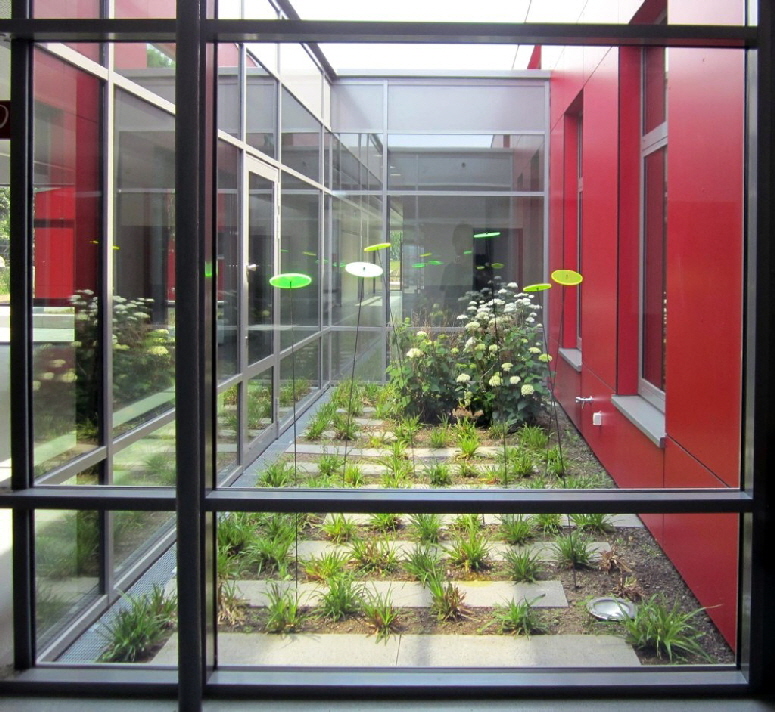 Der produzierte Strom kann auf einem Infotableau im Haupteingangsbereich abgelesen werden. Das überschüssige Dachflächenwasser und die Außenanlagenflächen entwässern in Mulden und Rigolen.