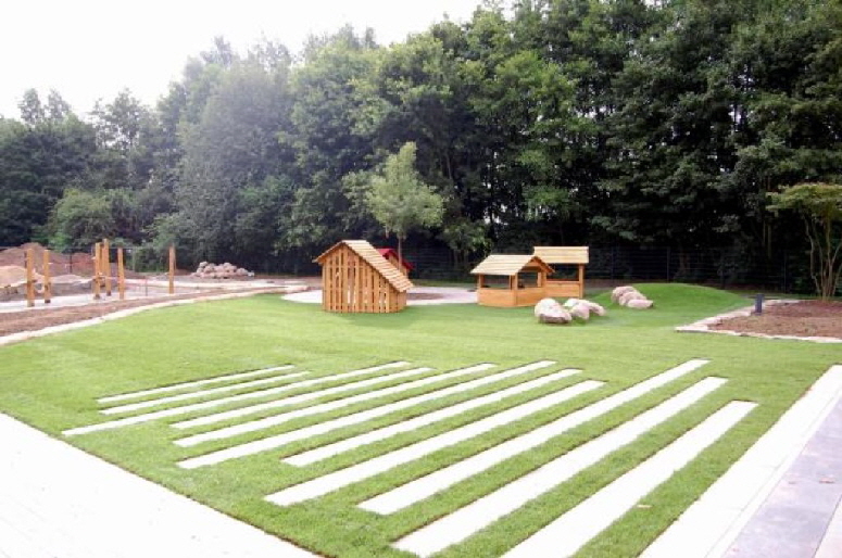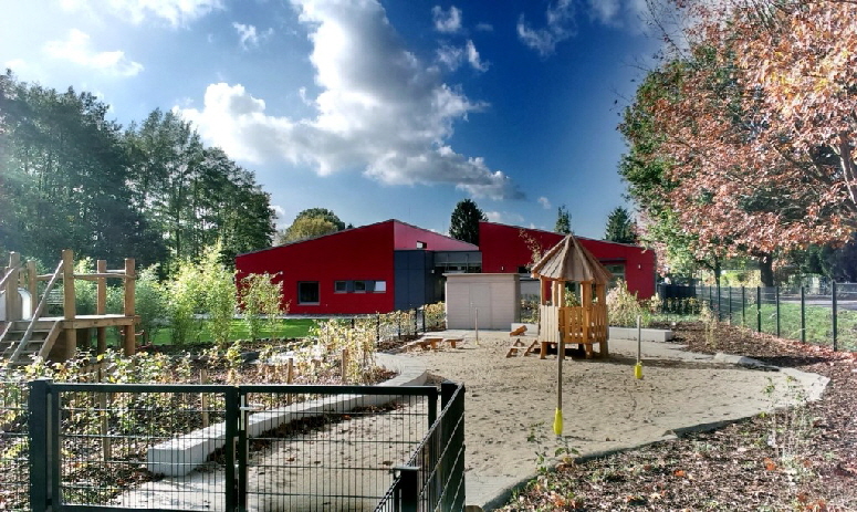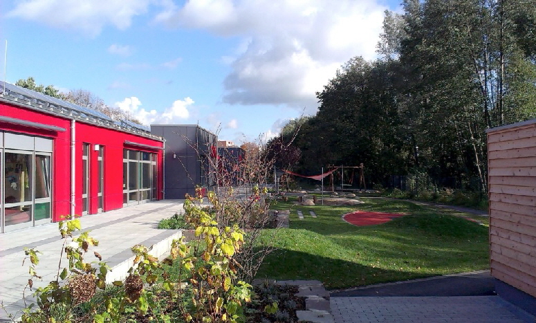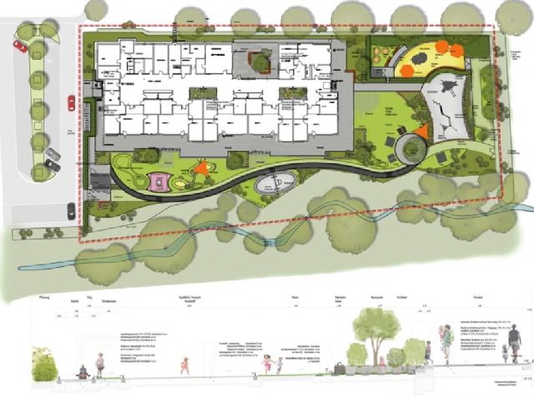 Bei einem gemeinsamen Workshop mit den Architekten entstand die Idee und der Entwurf zu den Außenanlagen der KiTa. Für die einzelnen Altersgruppen entstanden jeweils eigene Spielbereiche, die eingebunden in das Gesamtkonzept eine Spielstraße entlang des Bachverlaufs bilden. Die Spielstraße und der Bachlauf werden begleitet von einer Bobbycar-Rennstrecke, die die Idee bildlich umsetzt. Es gibt den einzelnen Gruppen vorgelagerte großzügige Terrassen, die über eine kleine Sitzkante in das tieferliegende Außengelände überleiten. Die einzelnen Gruppen erhalten unterschiedliche Solitärs, die die Wiedererkennung und Identifikation entlang der langen Fassade erleichtern. Ein umfangreiches ökologisches Konzept wurde realisiert. Fast die gesamte Dachfläche wurde extensiv begrünt. Auf den nach Süden ausgerichteten Satteldachflächen wurde eine Solaranlage installiert.