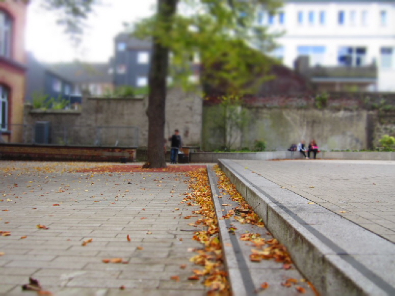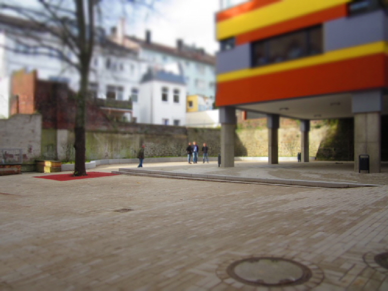Es wurde ein Pflasterbelag abgestimmt auf den Klinker der Altbaufassade ausgesucht, der mit seinen changierenden Ockertönen einen warmen und einladenden Charakter ausstrahlt.