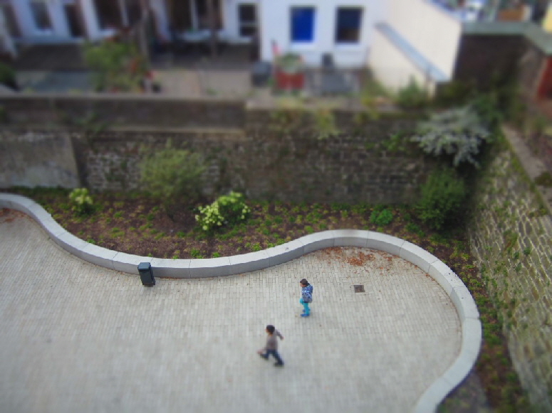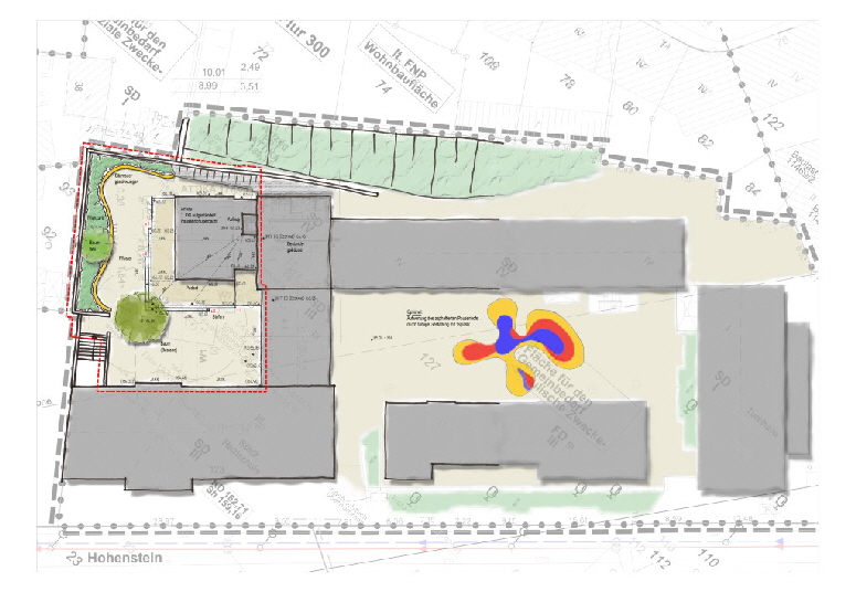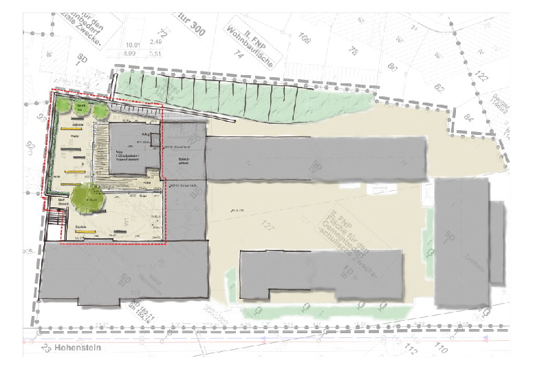 Da Aktivitäts- und Bewegungsflächen im östlichen Pausenhof ausreichend vorhanden sind, wurde der Schwerpunkt in der aktuellen Planung im Angebot von Rückzugsräumen und Treffpunkten gelegt. Eine lange geschwungene Sitzmauer bietet ausreichend Sitzmöglichkeiten und fasst zu den vorhandenen Grenzmauern ein Hochbeet ein. Hier finden Gräser, Hortensien und Felsenbirnen einen geschützten Standort und sorgen für etwas Grün.