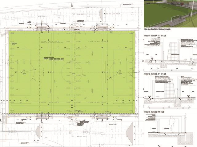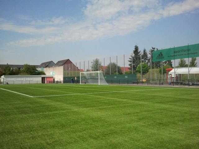 Die Anlage bestand aus einem Kunstrasensystem der 2. Generation und wurde Mitte der 90-Jahre fertiggestellt. Der Kunstrasen liegt auf einer 12 mm dicken Regupol-Matte. Der Kunstrasenbelag wurde unter Schonung der ET- Matte abgeräumt. Die ET-Matte konnte insgesamt erhalten bleiben. In den Randbereichen, den Stößen und im Anschluss an die vorhandene Kastenrinne traten nach dem abräumen des Kunstrasens deutliche Schrumpfungserscheinungen an der ET-Matte auf. Die ET-Matte wurde in den Randbereichen geschnitten und eingekürzt und durch eine neue Bahn parallel zur Entwässerungsrinne ersetzt. Die restlichen Bahnen wurden nach dem Entfernen des alten Nahtbandes auf Stoß gezogen und neu verklebt. Im Rahmen der Umbauarbeiten wurden entlang der Umgangswege Jugendtoraufstellflächen ergänzt, sowie die Barrieren erneuert.