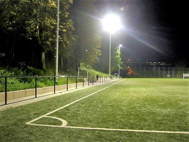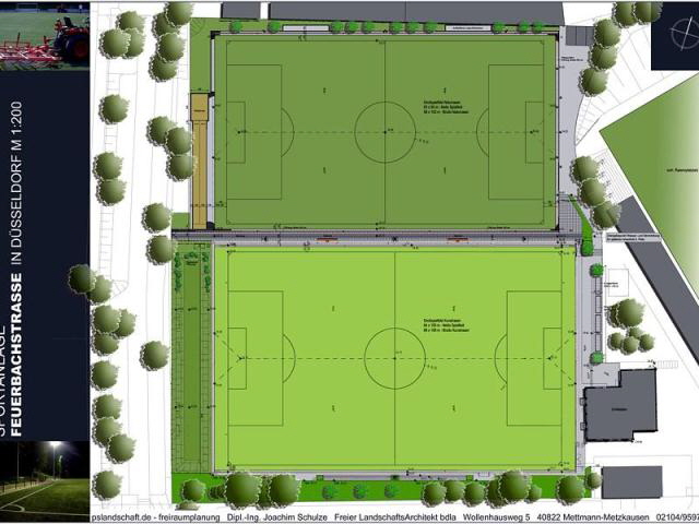 Sanierung und Umbau der vorhandenen Tennenplätze der Bezirkssportanlage Feuerbachstraße (TURU Düsseldorf) in einen Kunstrasenplatz mit Sand- und Gummifüllung und einen Naturrasenplatz. Zur Ausführung kam ein Kunstrasenbelag mit gerader Faser, einer Länge von ca. 40 mm und 6 kg EPDM-Neugummigranulat (Desso DLW Challenge Pro) auf einer 30 mm dicken Elastikschicht. Der Platz dient als Trainingsplatz und erhielt zusätzlich auf der südlichen Platzseite eine neue Stehstufenanlage. Der Neubau der Trainingsbeleuchtungsanlage und der Einbau einer automatischen Bewässerungsanlage schließen das Sanierungskonzept ab. Der Platz entwässert über eine Hebeanlage über die belebte Bodenzone in eine Mulde auf der westlichen Stirnseite des Großspielfeldes. Die Mulde nimmt das Wasser von ca. 16.000 m2 angeschlossener Fläche auf.