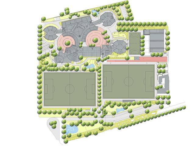 Für den Bau der Gesamtschule Langenfeld-Hilden war es notwendig, die bestehende Sportanlage 'Am Schlangenberg' zu verlegen und neu zu ordnen. Weiter war ein zentraler Gemeinschaftsparkplatz für Sportler, Lehrer und Schüler zu integrieren. An den Parkplatz schließt der Bushalteplatz für die Schüler an. Die fußläufige Erschließung der Schule erfolgt über den Verbindungsweg zwischen den beiden Großspielfeldern. Aus zwei ehemaligen Tennenspielfeldern entstanden zwei höhengestaffelte Spielfelder mit einem sandgestützten Kunstrasen (2. Generation). Der Hauptplatz erhielt neben der Kassenanlage einen überdachten Tribünenbereich mit kombinierter Steh- und Sitzstufenanlage. Einschließlich der Umgangswege mit umlaufender Barriere finden hier mehr als 1.000 Zuschauer Platz.