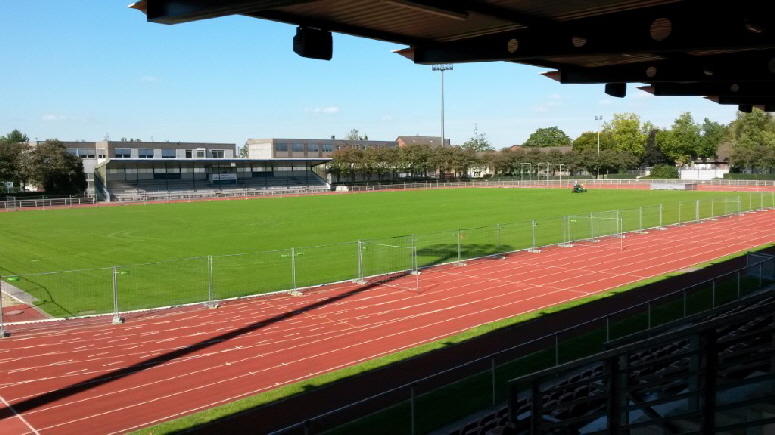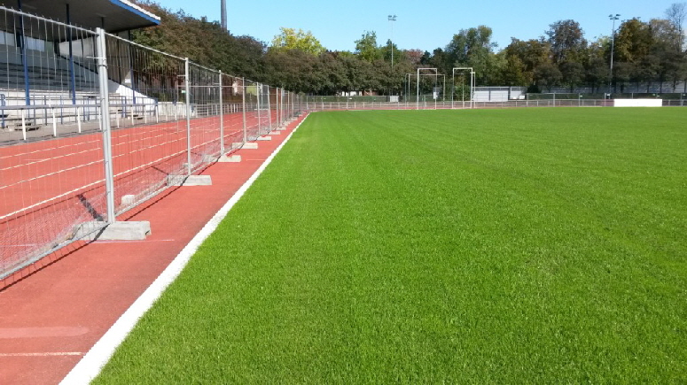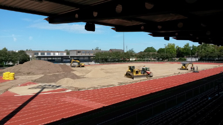 Dies führte zu einem erhöhten Pflegeaufwand. Die Dränschicht wurde vollständig erneuert, da nicht gleichmäßig und ausreichend dick. Das Rasentragschichtmaterial wurde nach Bodenuntersuchungen mit Sand und Lava aufbereitet und in reduzierter Dicke wieder eingebaut. Die automatische Beregnungsanlage wurde vollständig erneuert. Die Einsaat erfolgte mit vorgekeimten Saatgut. Der Rasenplatz wird noch bis April 2016 ein gepflegt und ist solange noch für den Spielbetrieb gesperrt.